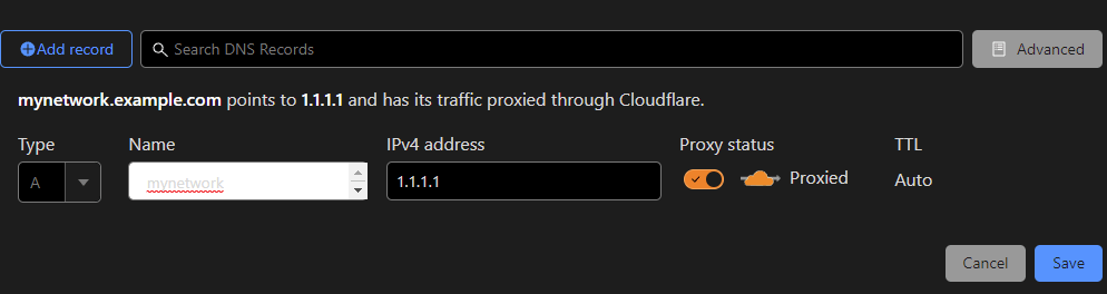 | Host Name | The subdomain we set up in Cloudflare (in the case above, its mynetwork.example.com) |