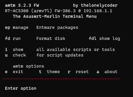 Asus Merlin has a fairly powerful terminal menu that simplifies a lot of tasks, we’re going to use it here to get a few things set up. Type amtm to load the menu up.