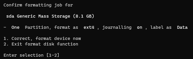 First, type in the fd command. This will prompt you for various decisions relating to formatting the USB drive you just plugged in. Unless you explicitly want something different, you can use the recommended settings for most of them.