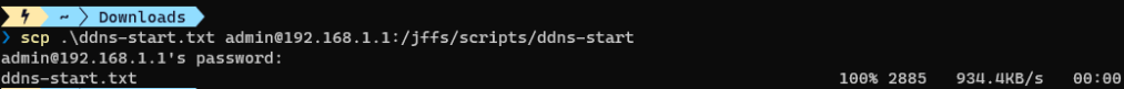There’s a few options for doing this, but I’m going to use scp for this. From a standard terminal prompt (not your ssh session), type in scp [path to local file] [loginUser]@[routerIP]:/jffs/scripts/ddns-start – you’ll be prompted to enter your ssh credentials again.