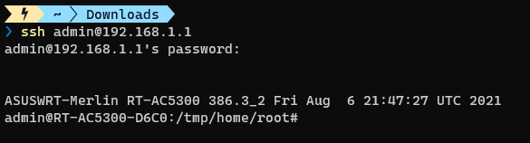 Now that we’ve got ssh set up, we’re going to log into the box. Open up a terminal, and use ssh [loginUser]@[routerIP] Where loginUser is the username you log into the webUI with, and routerIP is the IP address of the router. Enter the password, and you’ll be presented with the session prompt.